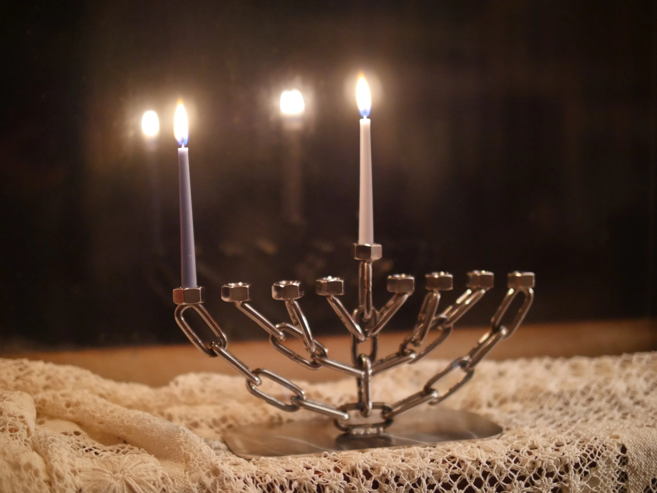 Traditional nine candle Hanukkah menorah made from stainless steel chain, nuts, and recycled scrap